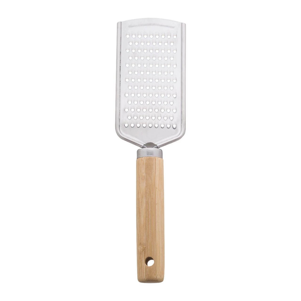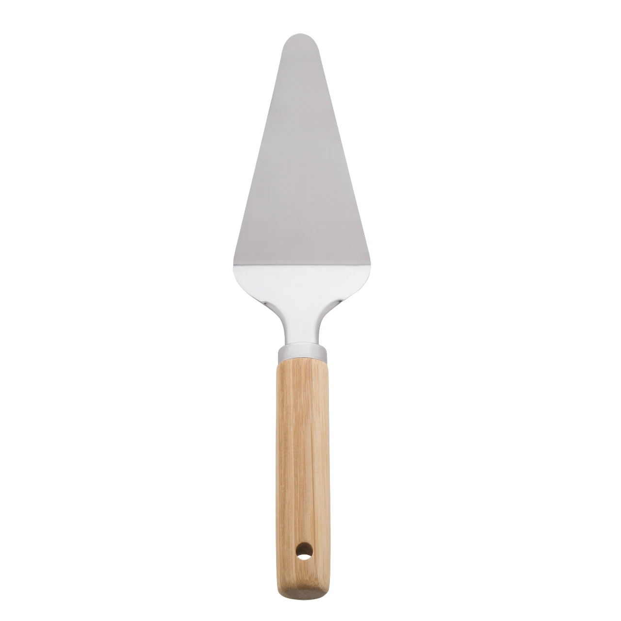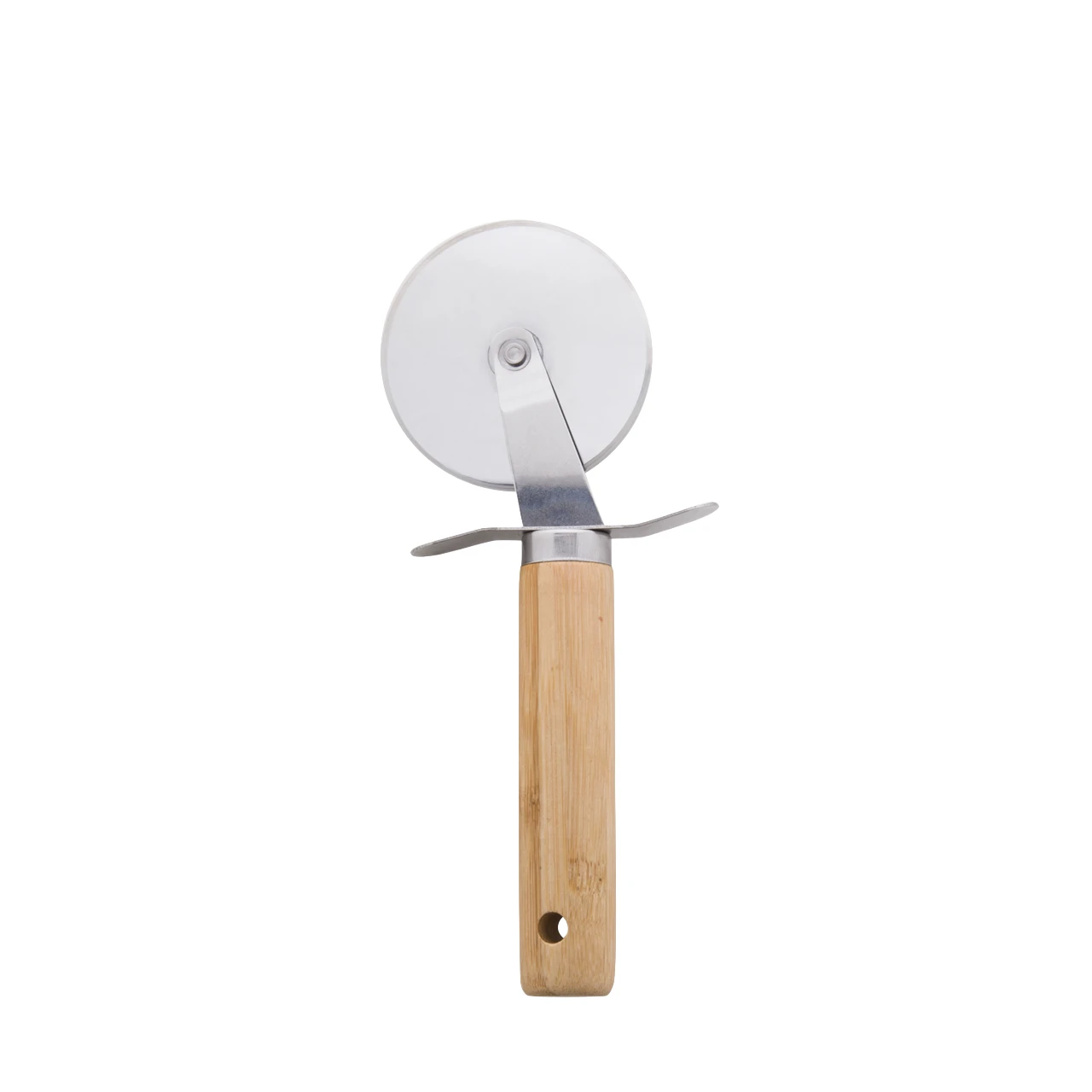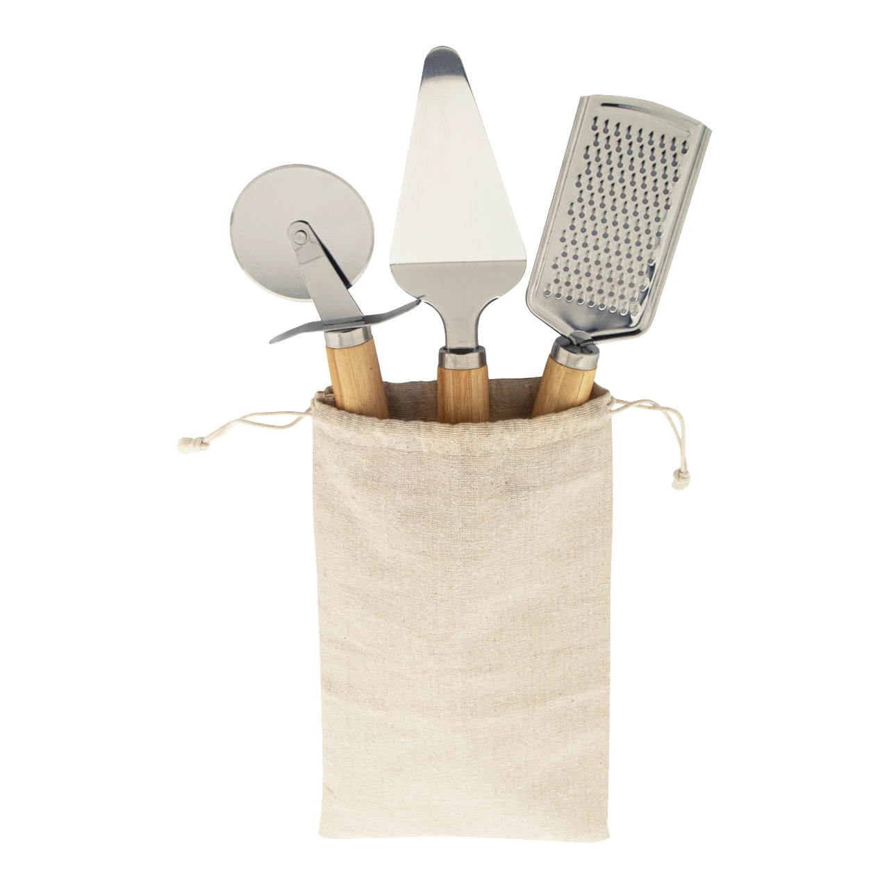 3 pc stainless steel, bamboo handle pizza serving set in cotton drawstring pouch. Including cheese grater, pizza cutter and spatula.