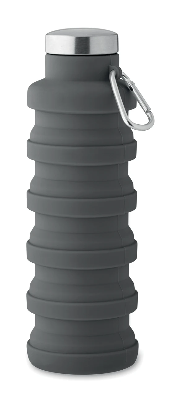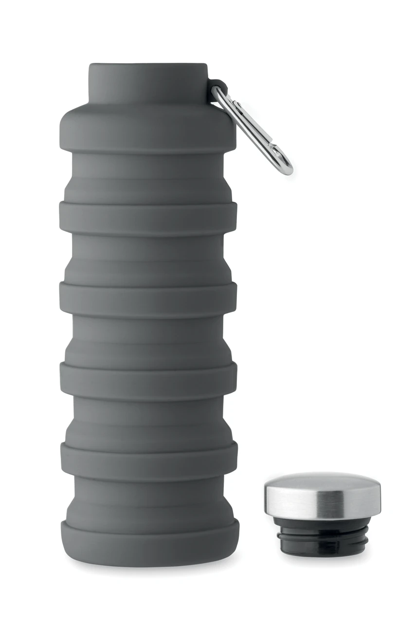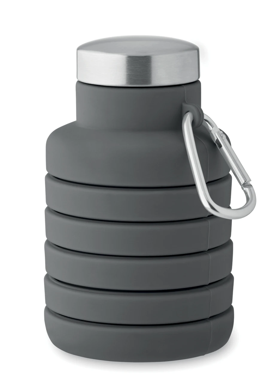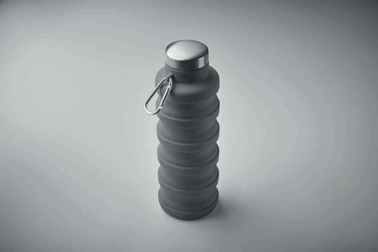 Collapsible silicone bottle with a stainless steel lid and an aluminum carabiner. Ideal for travel, sports and everyday use. Easily collapses when not in use, saving space. Capacity: 500 ml.