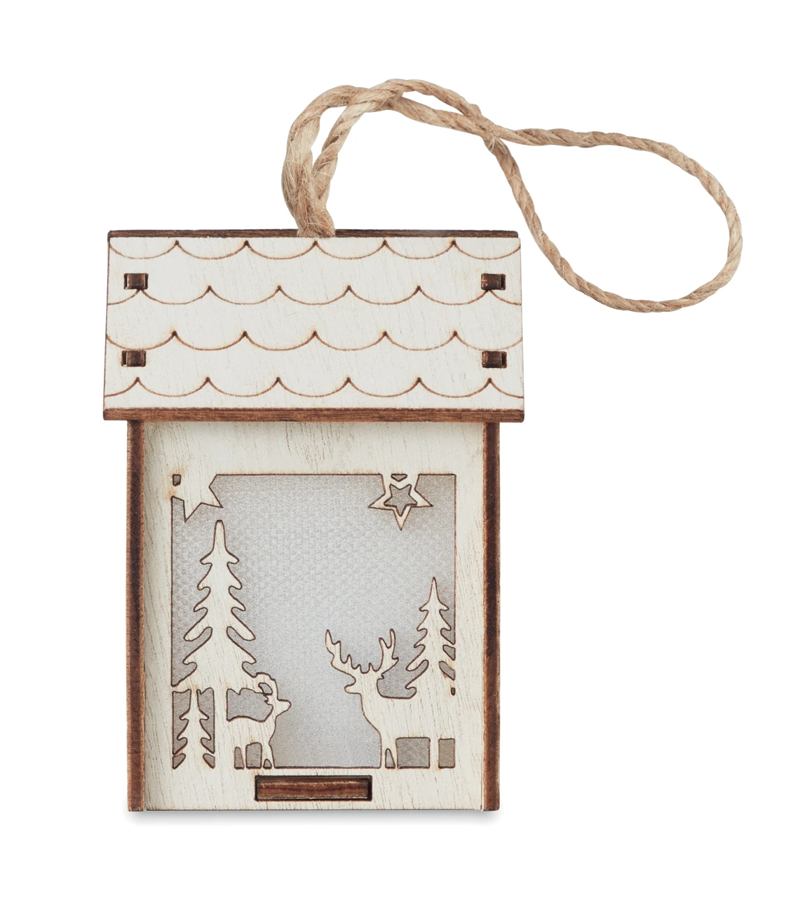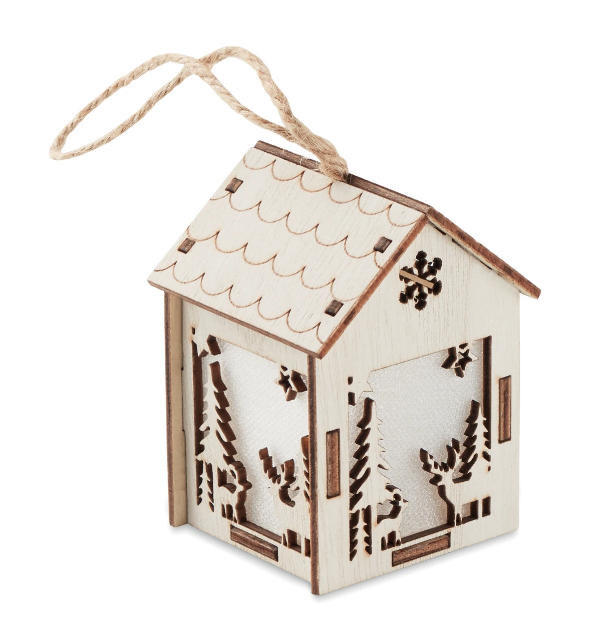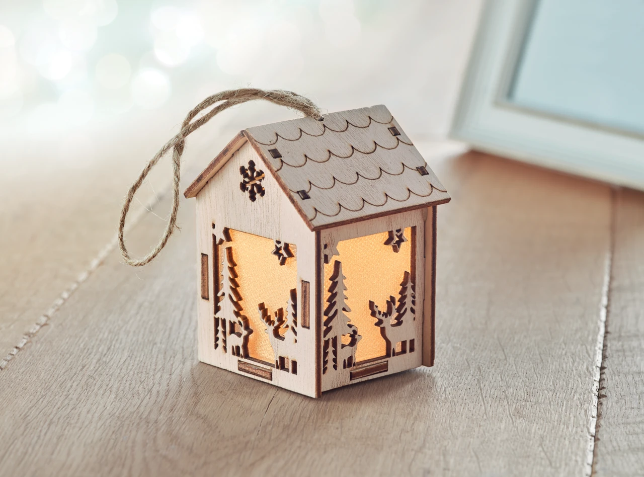 MDF decorated house with light inside with Christmas ornaments and hanging cord. Including 3 AG10 batteries.