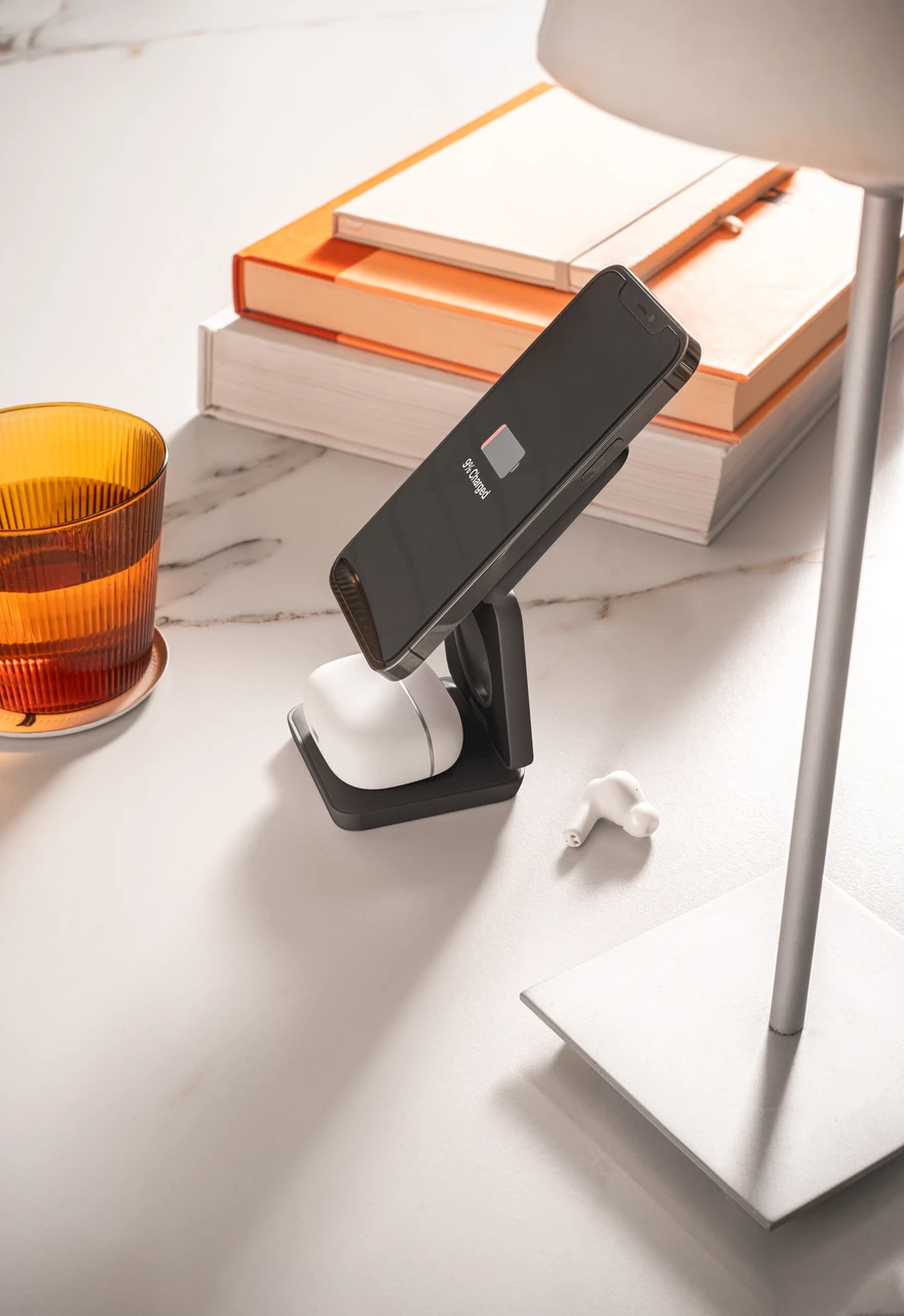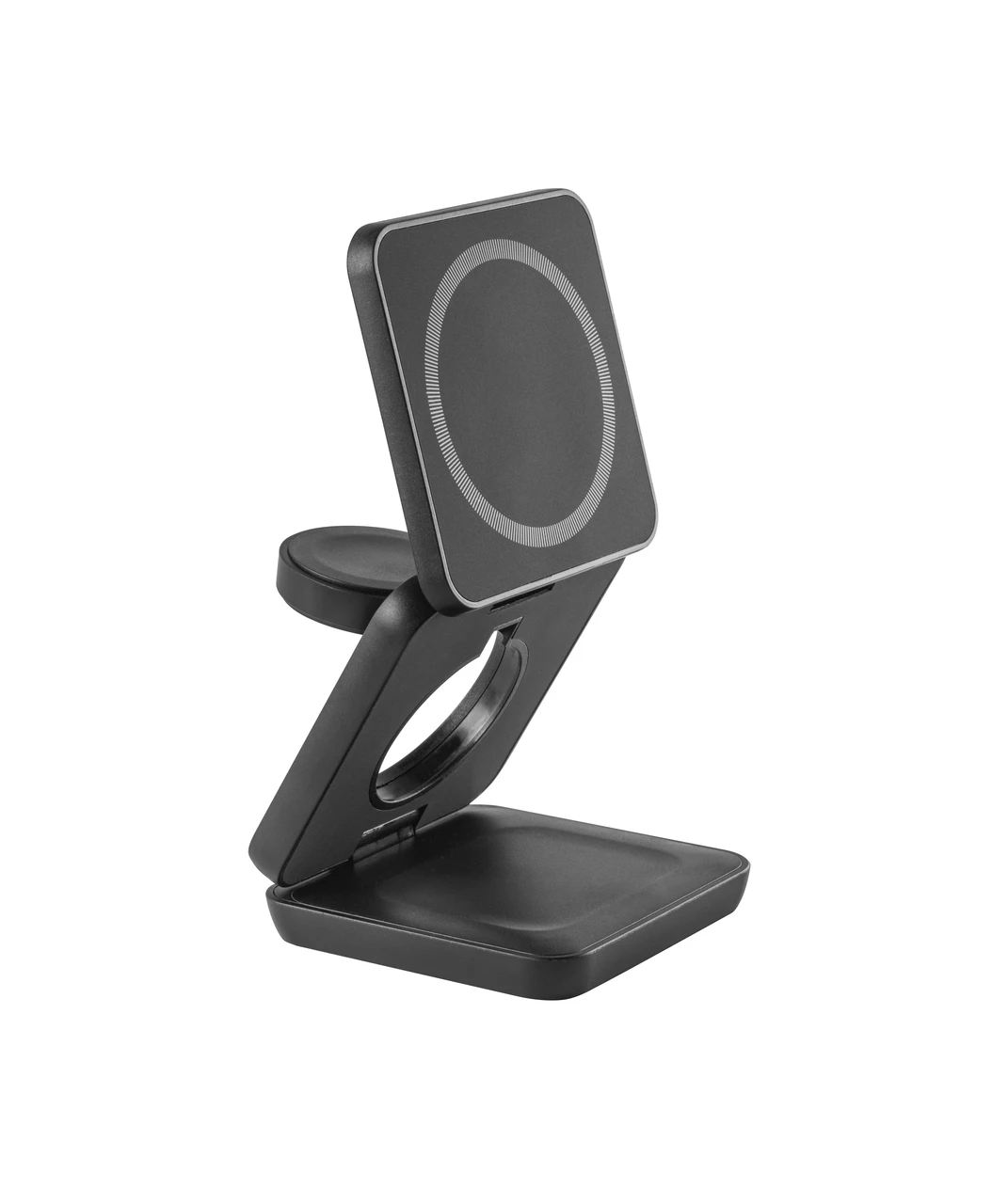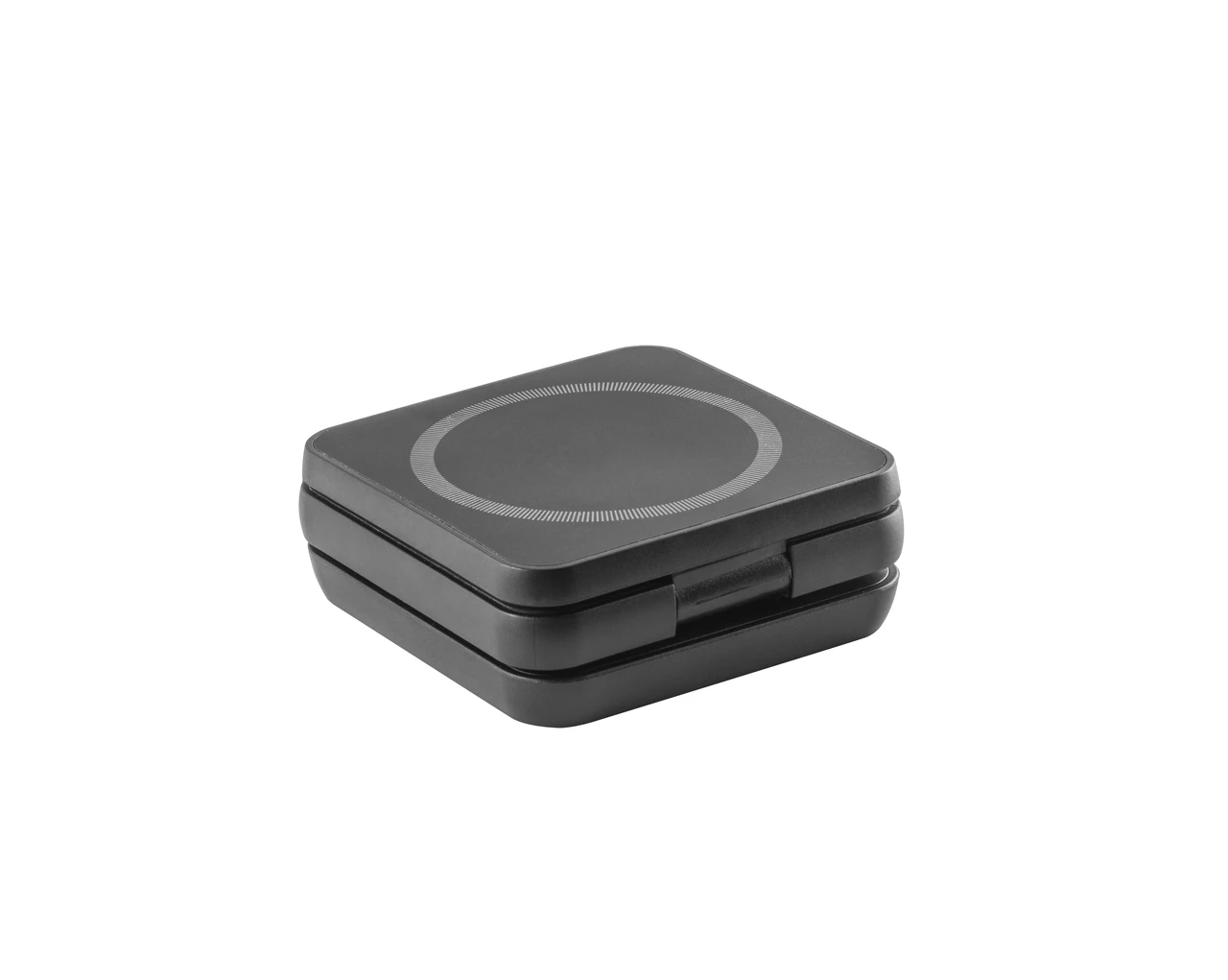 Compact foldable charger for simultaneous charging of up to three devices: smartphone (15W), headphones (5W) and watch (2.5W). Made of 100% recycled ABS plastic, with a magnetic plate for stable attachment of the phone. Includes USB-C cable and an additional magnetic ring for devices without a built-in magnet. Delivered in an eco-friendly kraft paper gift box.