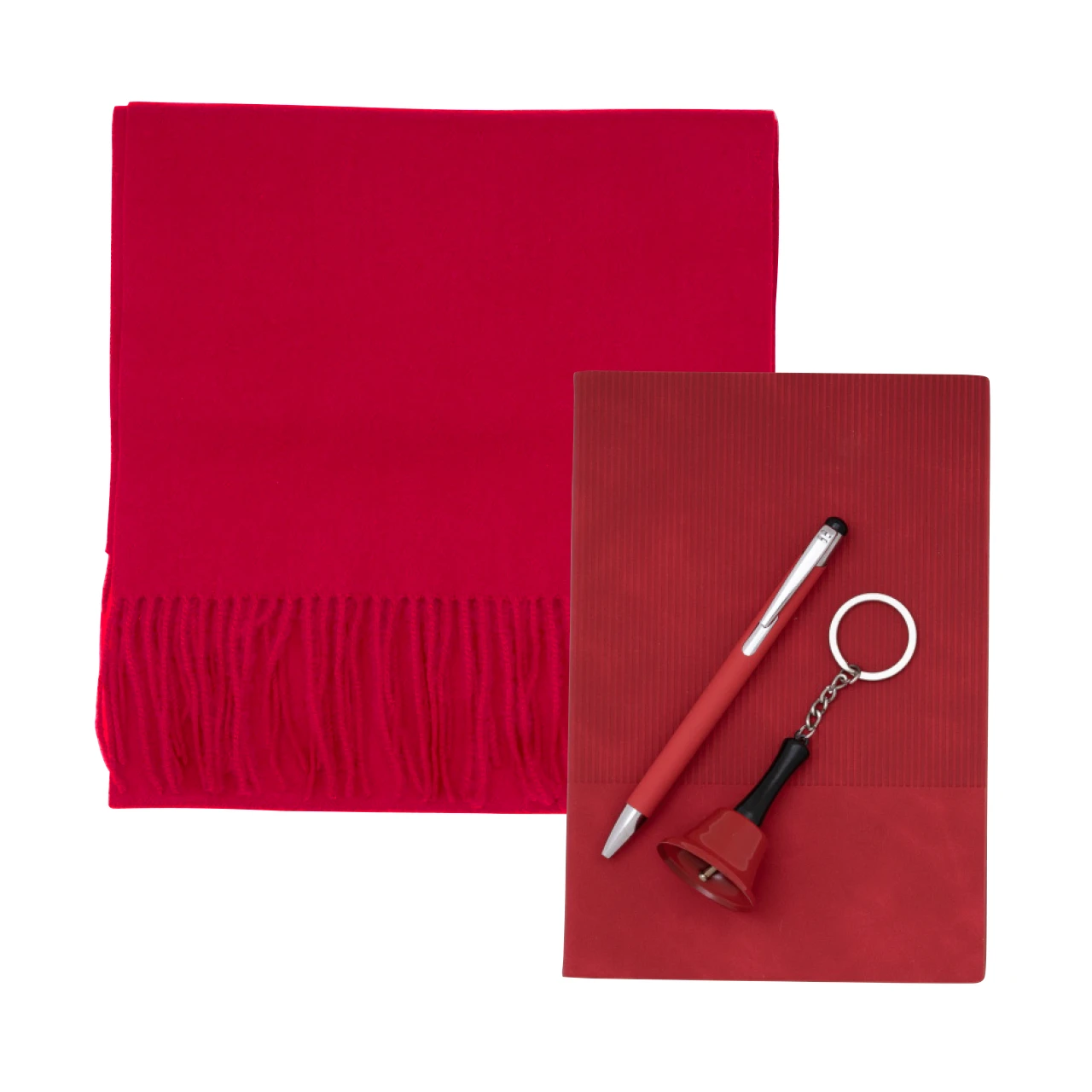 An elegant set in red, combining practicality and style. It includes a soft scarf with classic fringe, a comfortable notebook with a textured cover, a metal pen, as well as a key ring with a small bell - a detail that adds originality. The combination of accessories makes it a universal choice for corporate gifts, events and holiday campaigns. Suitable for personalization by printing or engraving to become a memorable promotional gift.