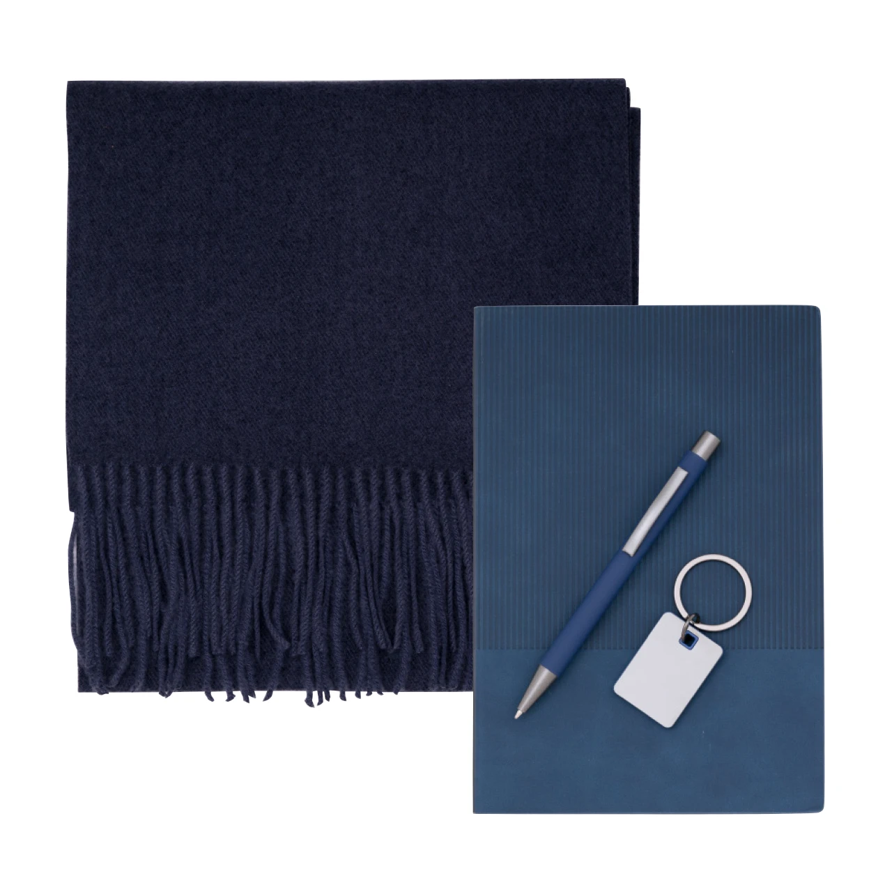 A classic set in navy blue that combines practicality and style. Includes a soft scarf, a notebook with a textured cover, a metal pen and a key ring with an elegant design. An excellent choice for business partners and clients, suitable for branding and presenting your company in an impressive way.