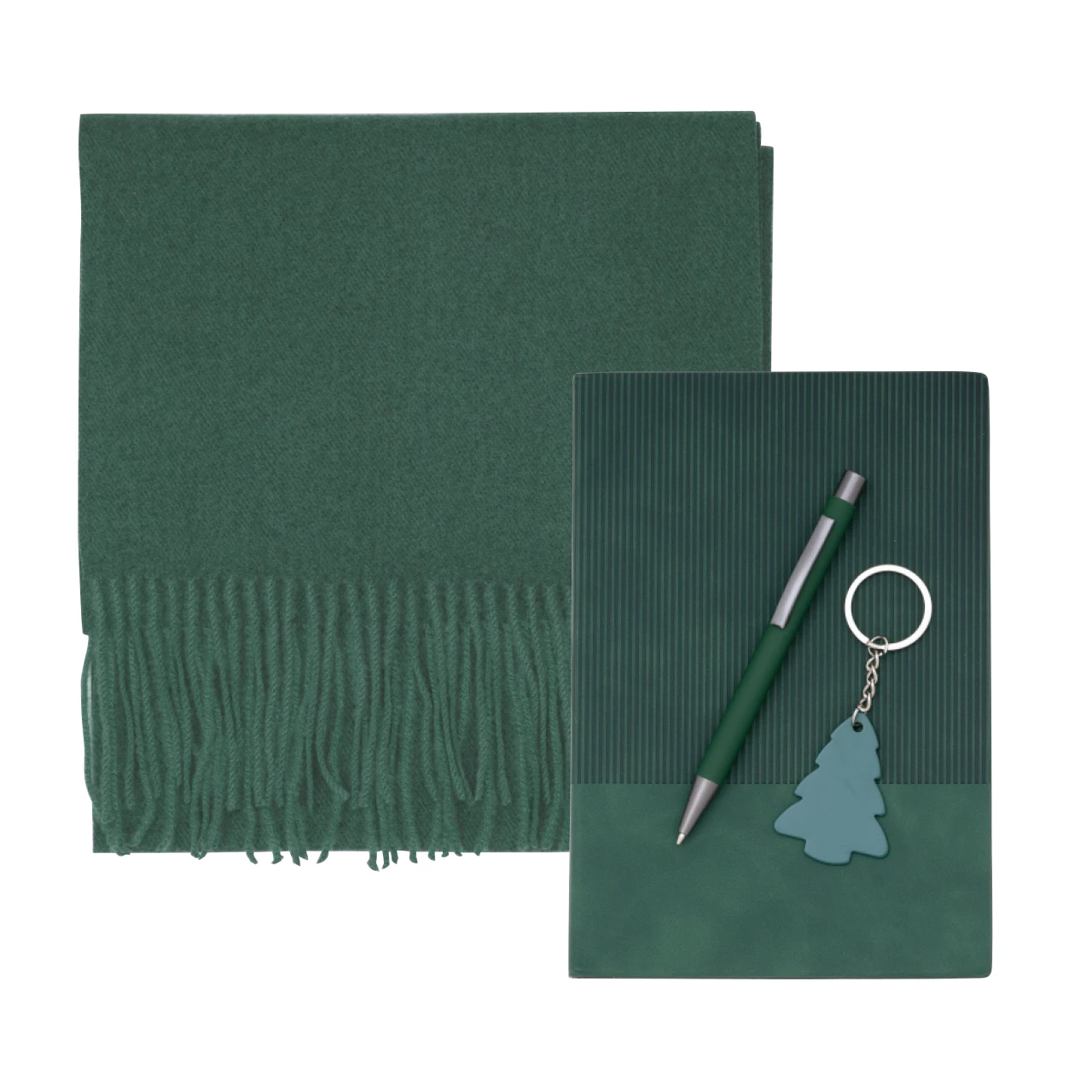 An elegant set in green, combining practicality and style. It includes a soft scarf with classic fringe, a comfortable notebook with a textured cover, a metal pen, as well as a Christmas tree keychain - a detail that adds originality. The combination of accessories makes it a universal choice for corporate gifts, events and holiday campaigns. Suitable for personalization by printing or engraving to become a memorable promotional gift.