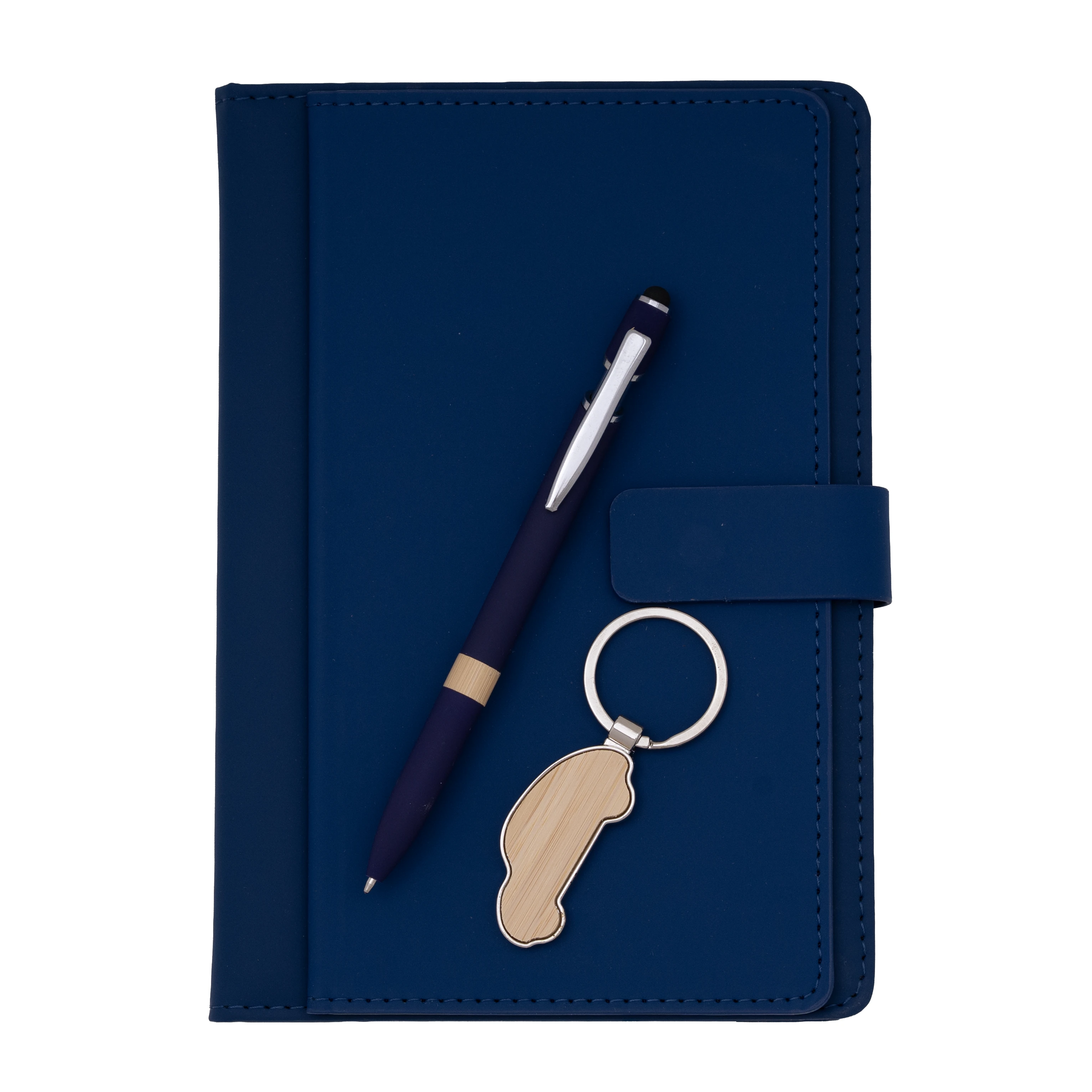 Този сет включва тефтер с твърда корица от еко кожа с магнитно закопчаване, химикалка в същия тон с бамбуков акцент и бамбуков ключодържател във формата на автомобил.