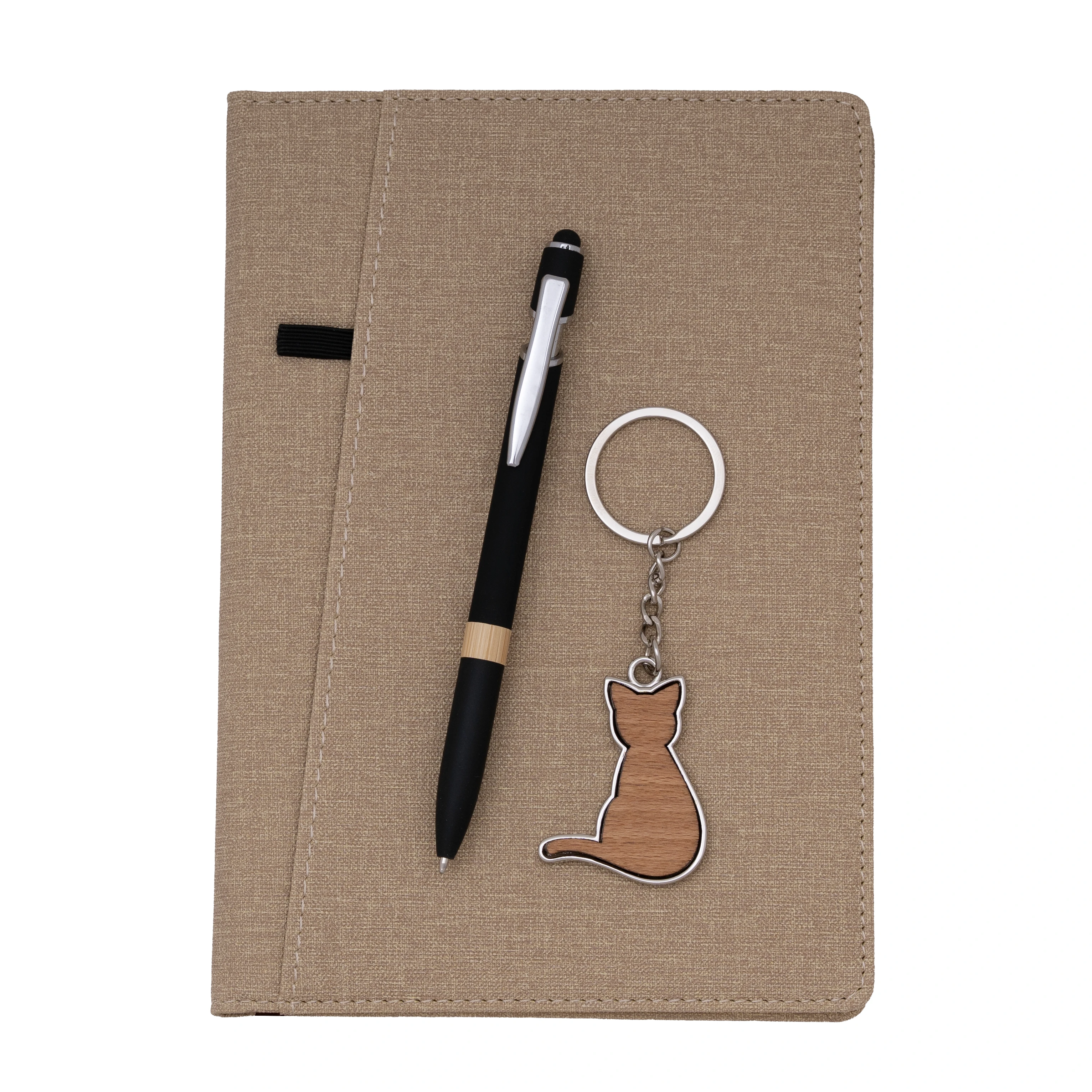 Елегантен сет в натурални тонове: тефтер с текстилна корица, бяла химикалка с бамбуков акцент и бамбуков ключодържател във формата на котка.