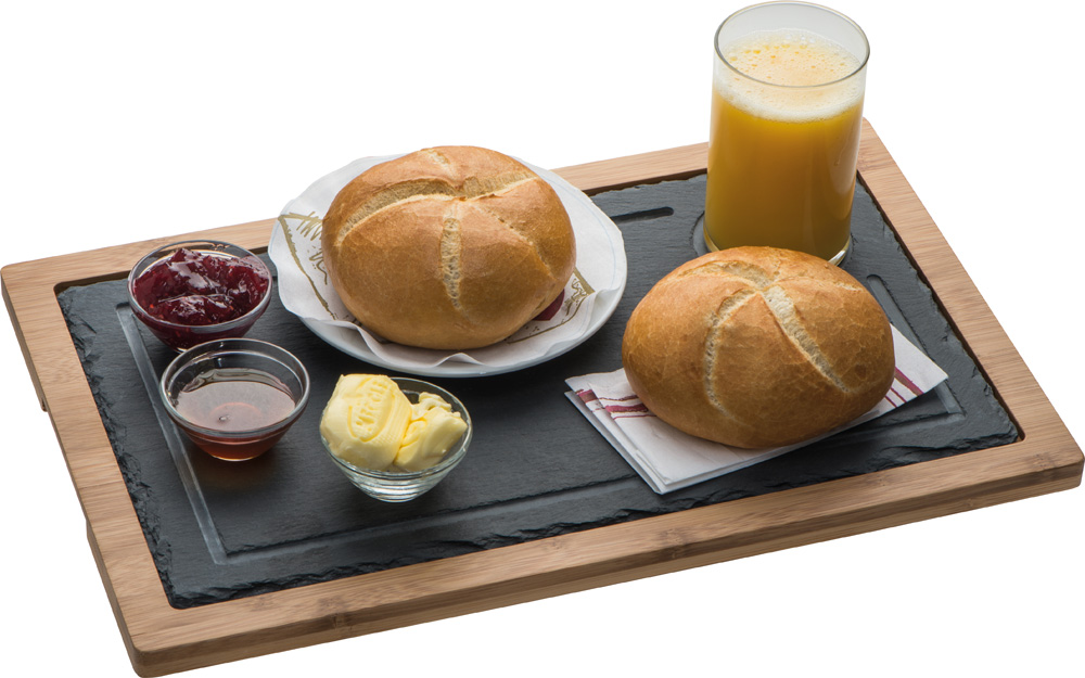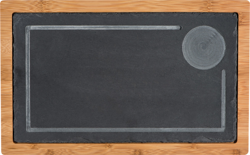 Модерна дъска за сервиране от бамбук с плоча от шисти. Вържу плочата има държач за напитки, както и циркулиращ дренажен канал.