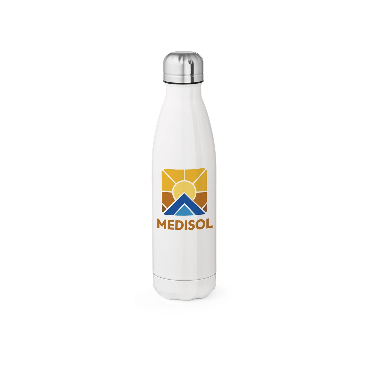 Бутилка 535 ml, изработена от рециклирана неръждаема стомана за сублимация. Двойно изолираната стена поддържа напитките ви топли в продължение на 14 часа и студени в продължение на 48 часа. Бутилката е херметична и подходяща за съдомиялна машина. Привлекателен аксесоар, който ще ви помогне да останете хидратирани. Предлага се в 4 различни обема и във варианти с метално покритие, матово покритие и за сублимация. Доставя се в екологична крафт кутия.